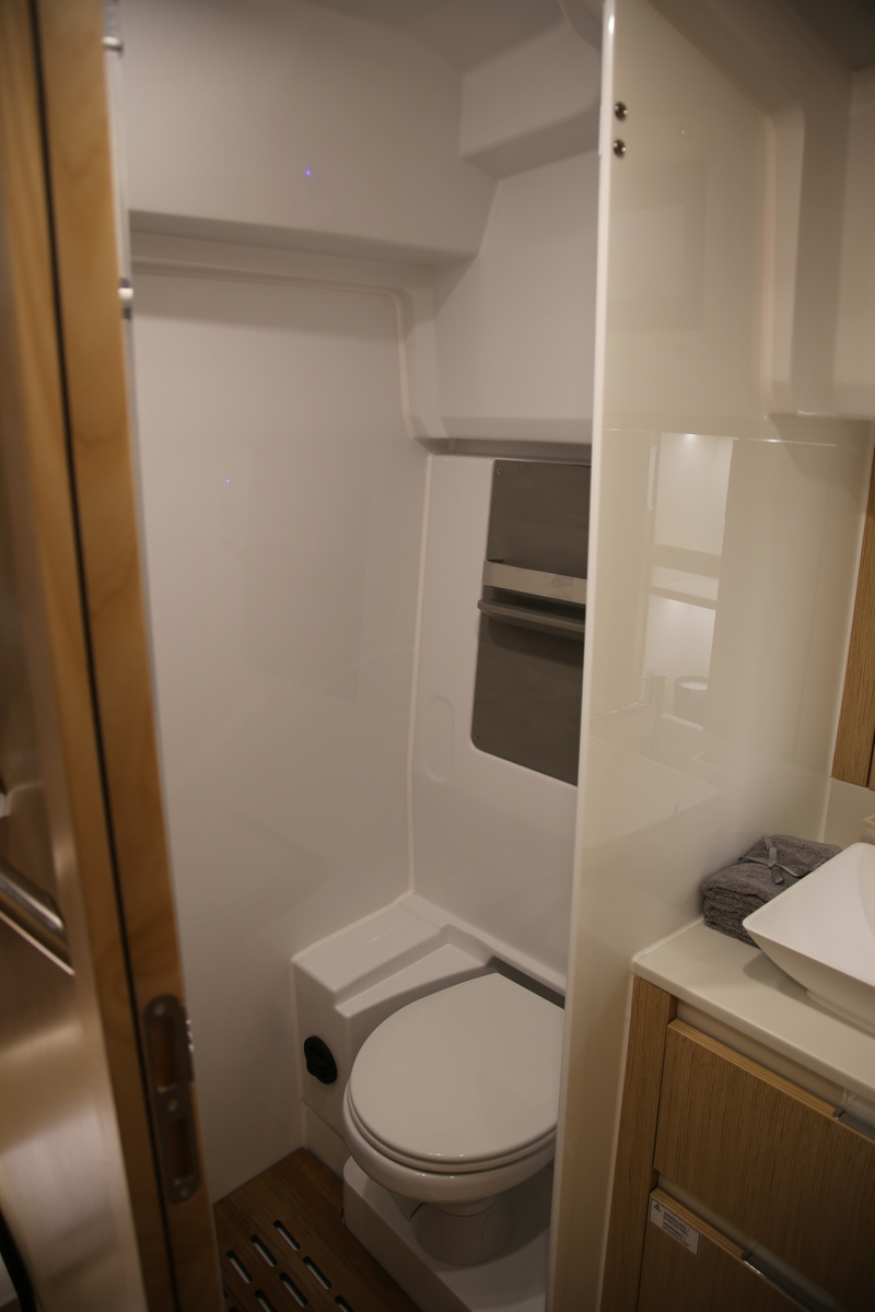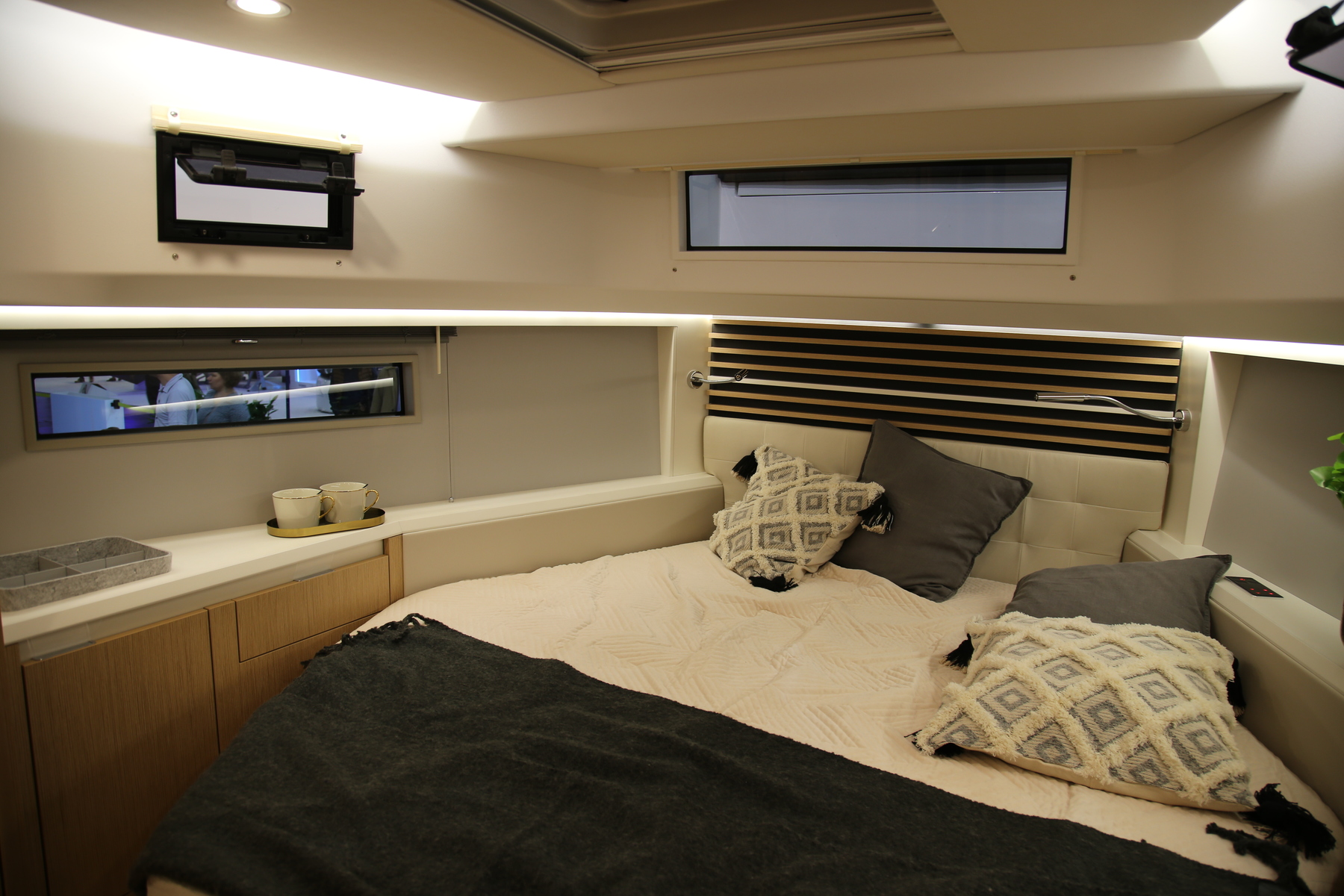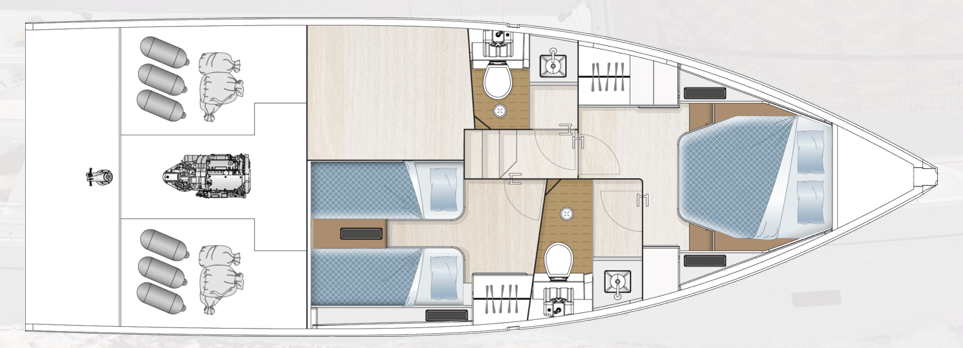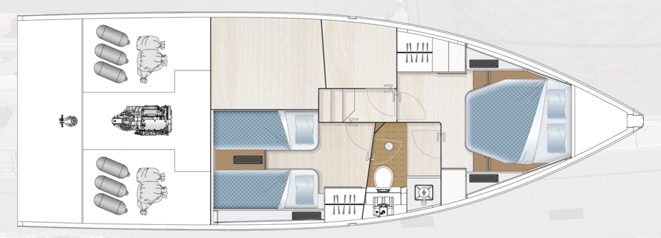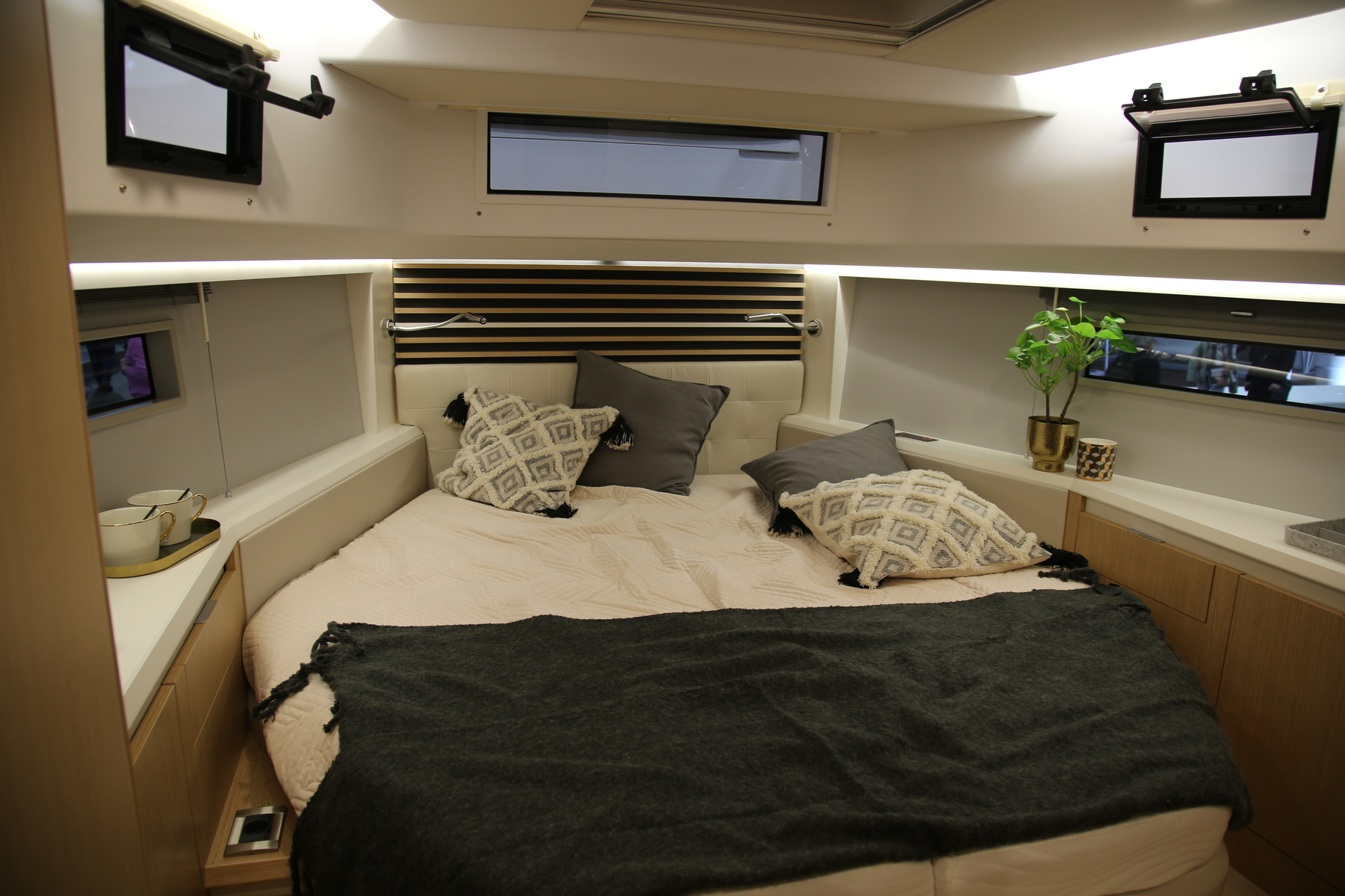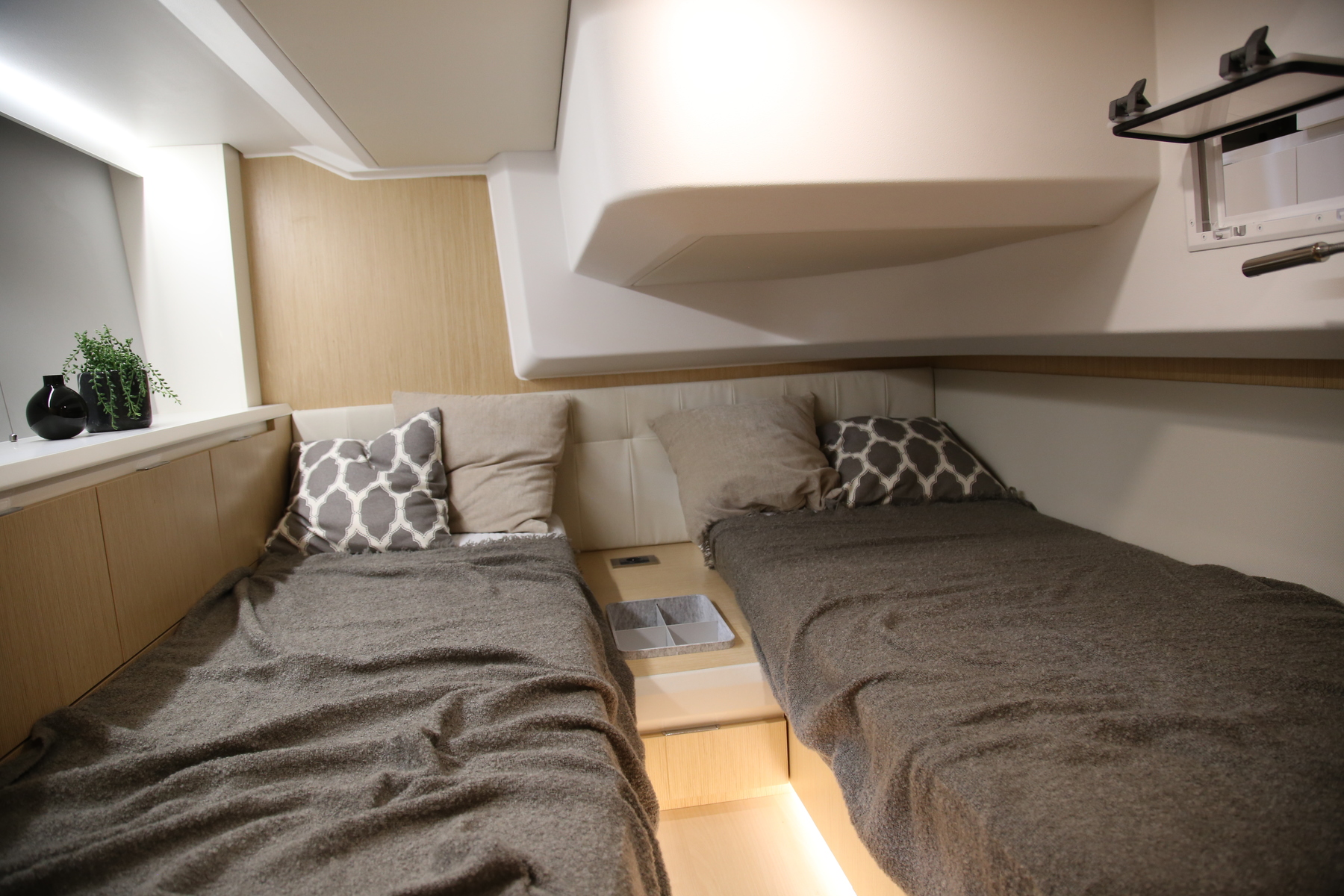 There are 2 cabins, one in the bow and one that extends under the decksaloon. The quality of workmanship and materials is of the usual high Moody quality.