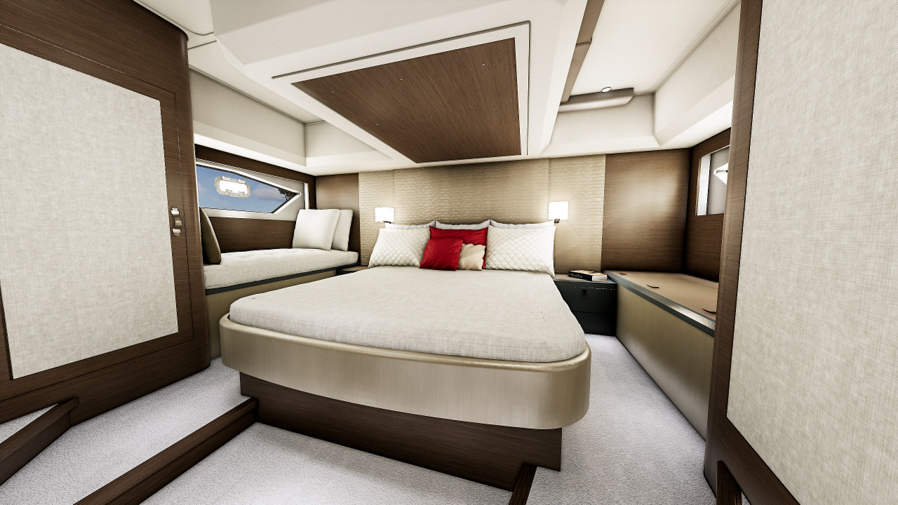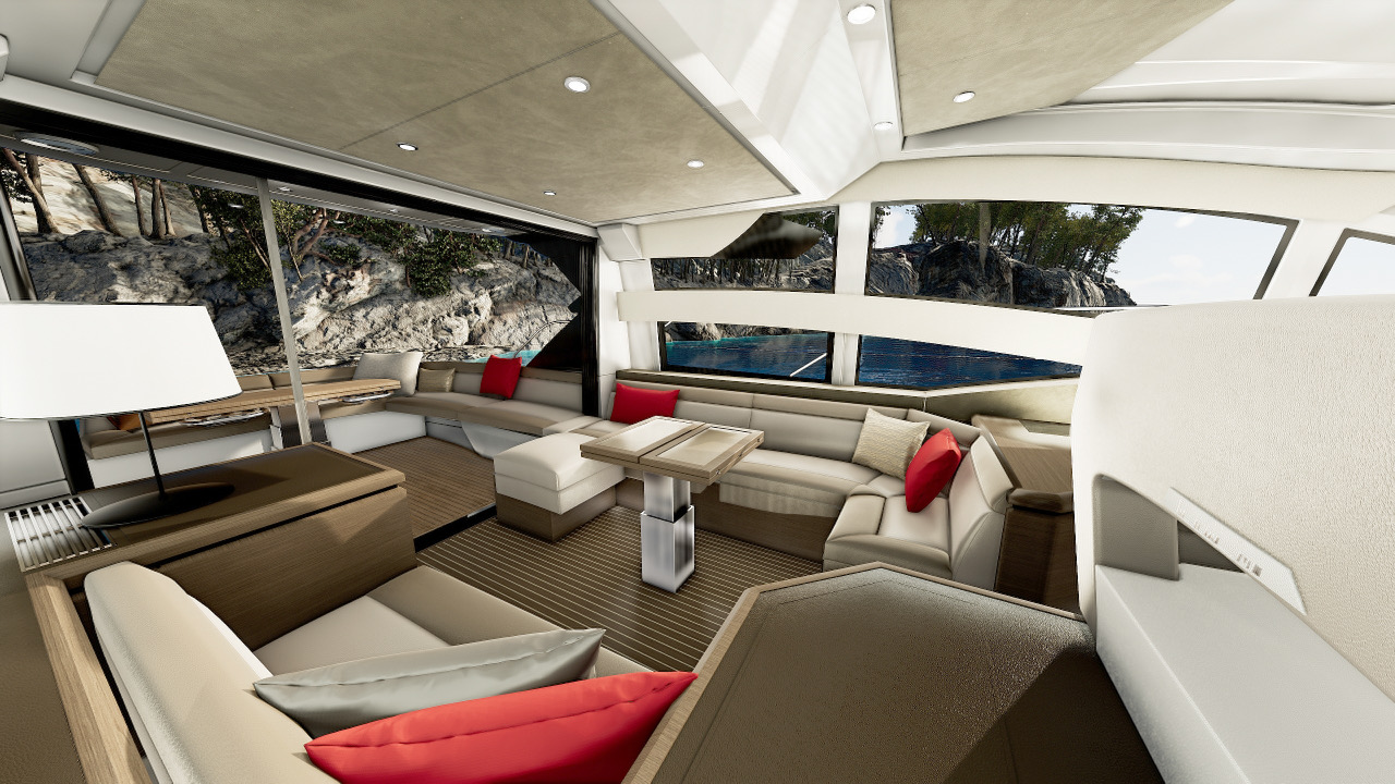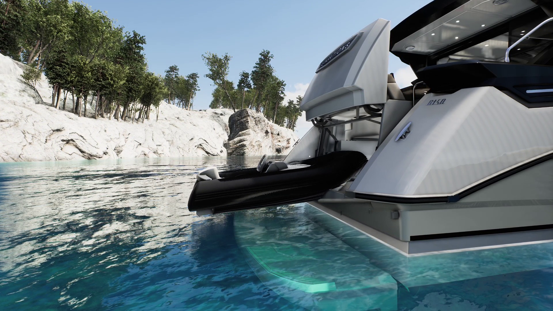 With a sporty look and equipped with the latest technology, the Gran Turismo 50 Sportfly is the paragon of thrills and lifestyle. With Volvo IPS 600 engine power on an AirStep® planing hull, driving sensations are second to none. Seamlessly integrated into the slender line of the boat, the Sportfly has a twin bench seat that converts into a sun-lounger on the driver’s side. A large protected lounge continues the cockpit on the main full-space deck and the interior and exterior merge seamlessly. An exterior galley is discretely located in the cockpit and can be enhanced with a worktop and grill at the stern. The tender garage, which is reached by the submersible swim platform, is ideal for a wide variety of water sports.