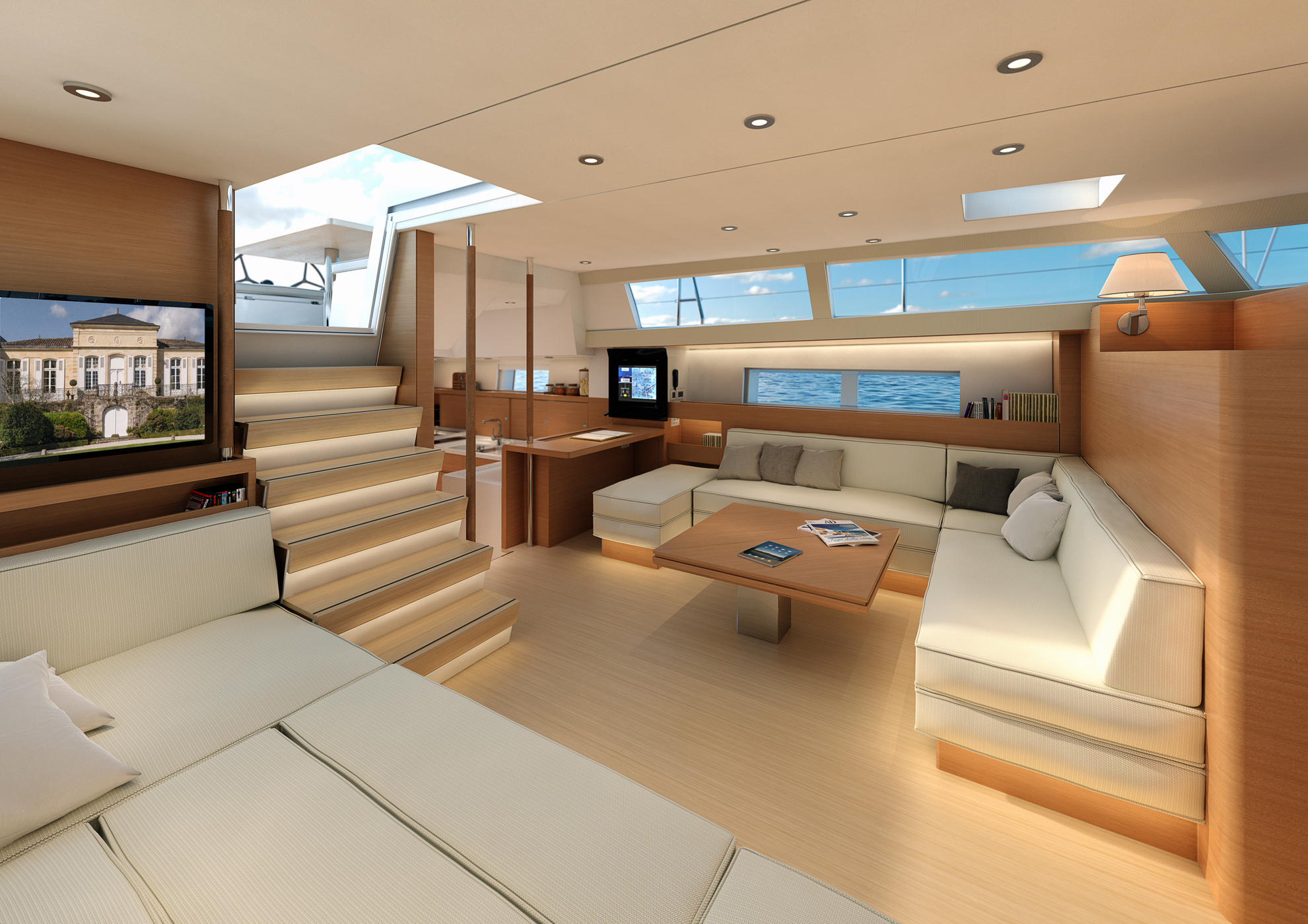 The Bordeaux 60, a successful monohull in its semi-custom 60-foot category (46 built in 8 years) revealed an exceptional saloon oriented towards the galley, providing a unique living space for this size of boat. The CNB 66 adopts the same principles: the asymmetric companionway facilitates communication between the saloon and galley. The chart table between the galley and dining area is multi-purpose and can be converted as desired into a bar, desk or nav station. This is the result of many discussions with sailing owners, seeking to optimise space while adapting to new styles of living and sailing.