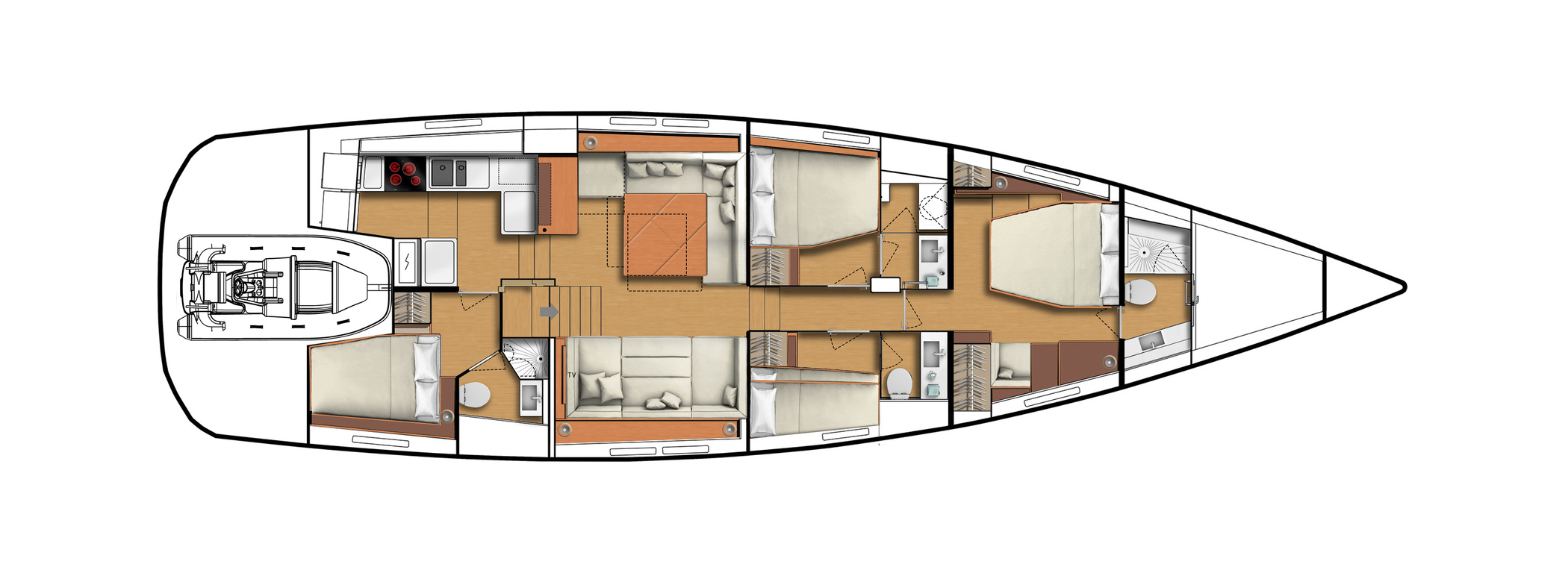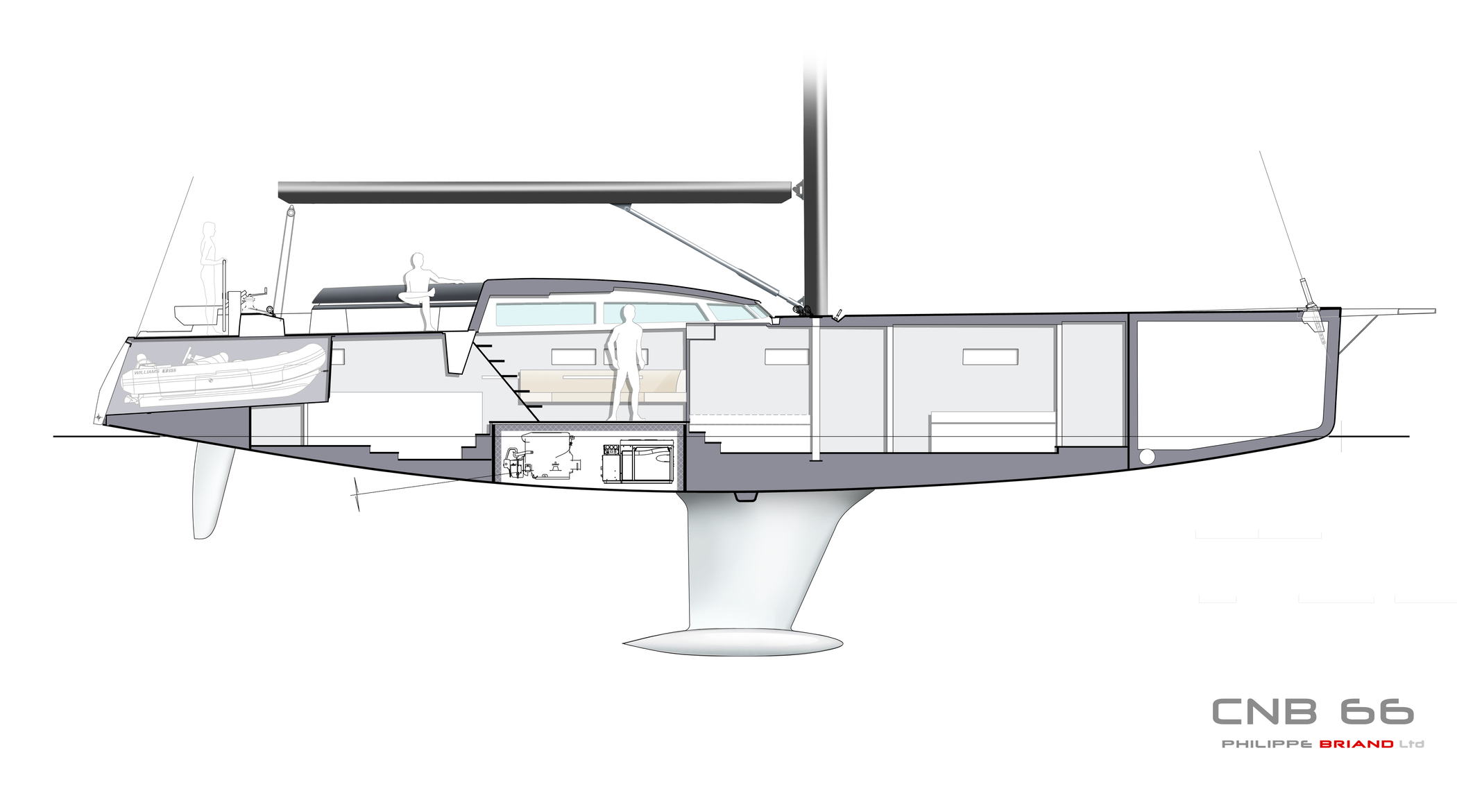 The hull of the CNB 66 was designed with speed through the water as a priority, while retaining the offshore seakeeping qualities essential for long cruises and short-handed sailing. The vertical stem, aft chine, twin rudders and bowsprit provide a high level of performance. At the same time, the many windows, flush deck, panoramic saloon, the garage for a 3.25 m tender (which can be launched or recovered in less than a minute, as on the CNB 76!)… afford a degree of comfort apparent when you live on her.